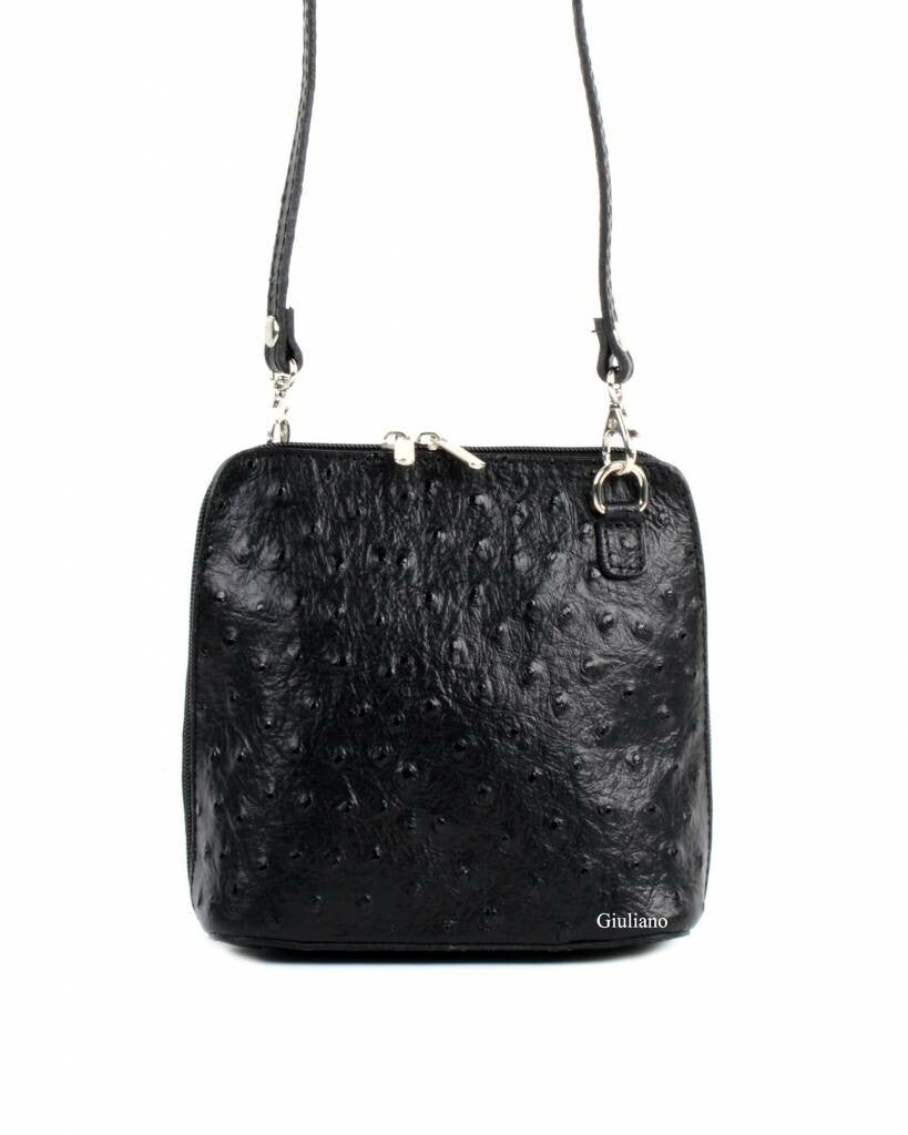 Lederen schoudertasje met struisvogeldesign die sluit met een dubbele rits tot de onderkant. Het tasje heeft nog een extra vakje met rits op een zijde en de schouderband is afneembaar en verstelbaar.