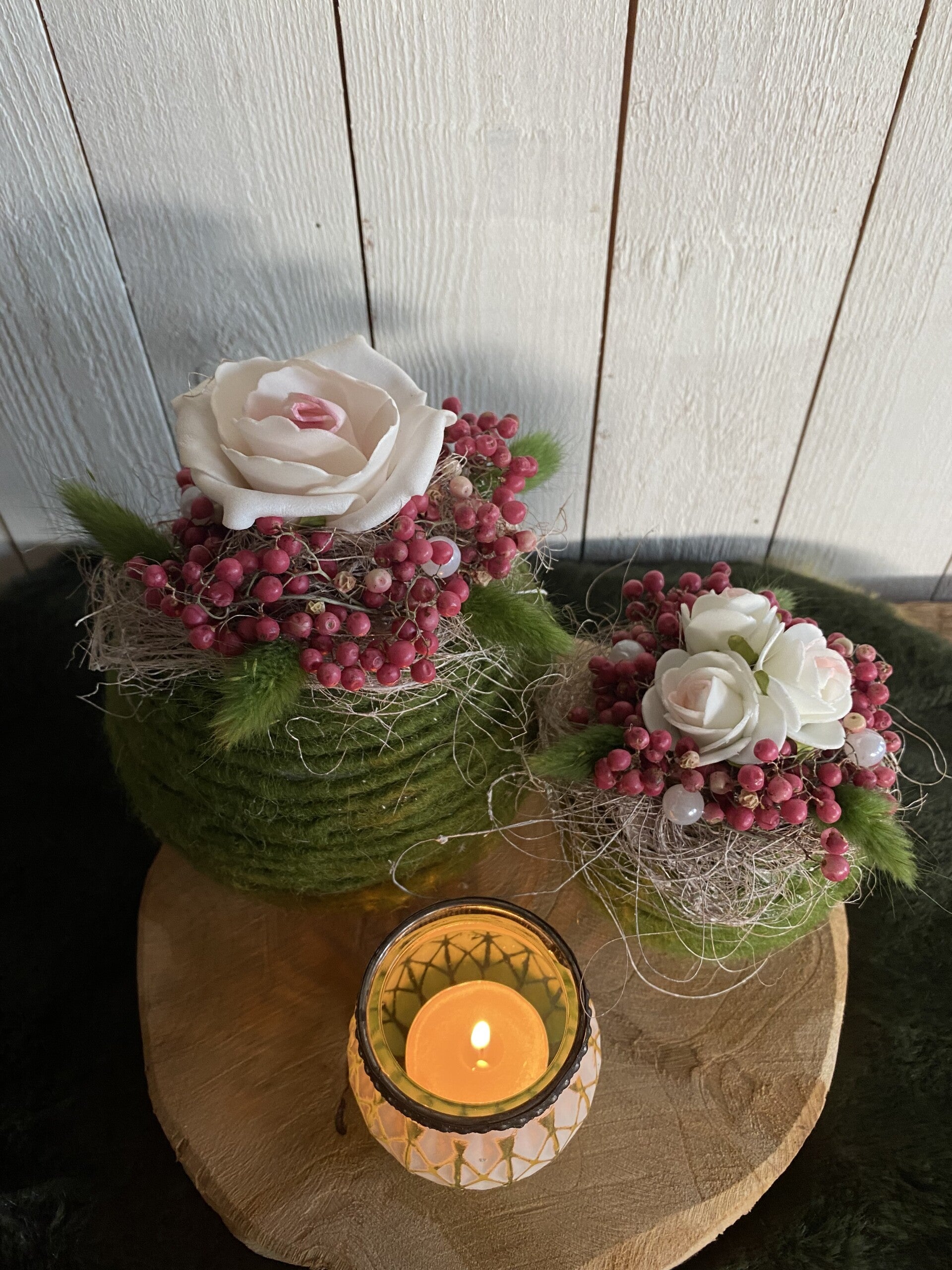 2 bollen met rozen worden gemaakt in deze workshop. Ipv groen kan er ook roze/bruin/paars gebruikt worden. afgewerkt op plankje met theelichtje